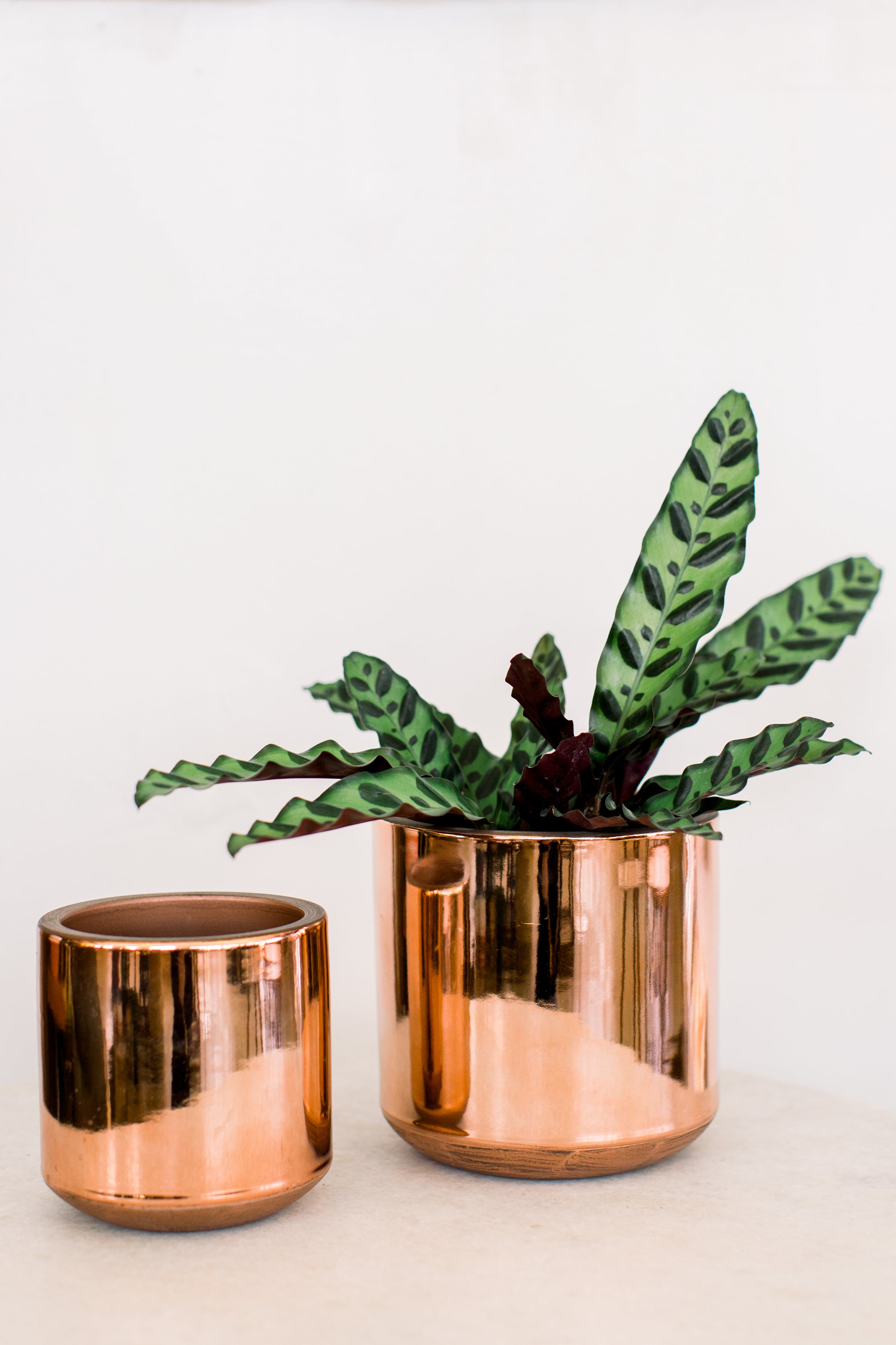 These copper plated ceramic cachepot planters are stunning for any household. Match this with any of our in house greenery for a modern chic compliment.